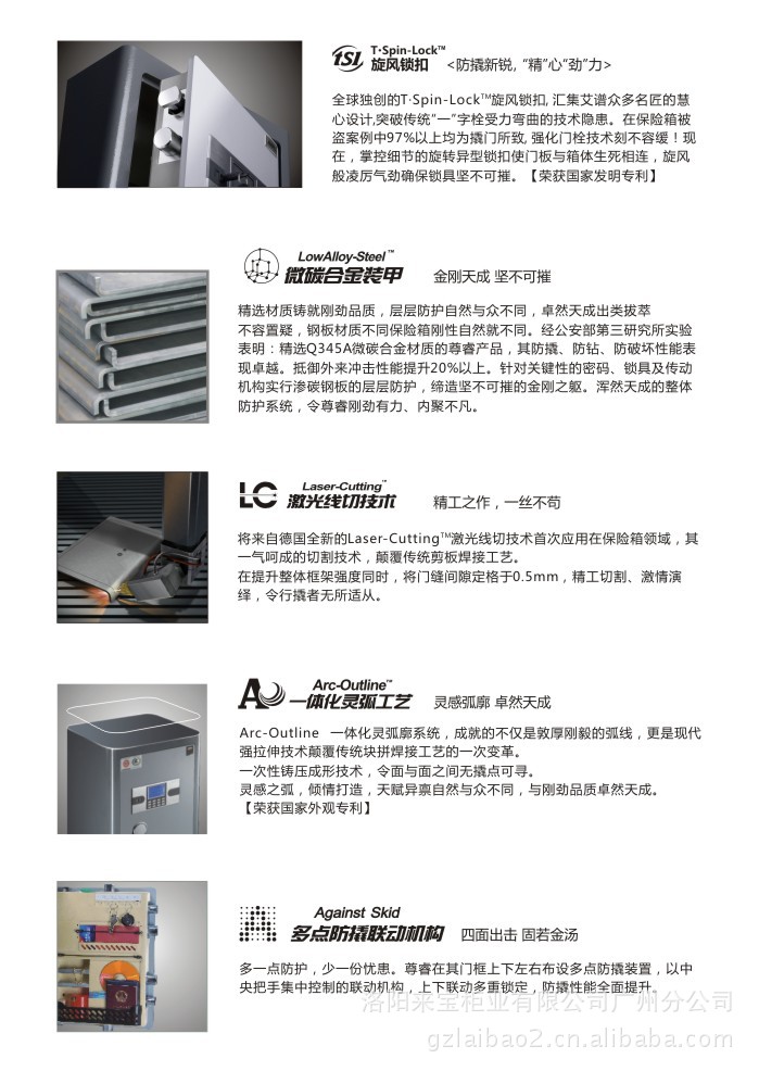 三、看防盗性能 保险箱的性能主要有防盗、防火、防磁、防水、防爆等,不同的要求应购买不同的保险箱,现在我国市场上主要是防盗保险箱,只能艾谱等少数品牌有防火保险箱,我们平时接触最多的也是防盗与防火保险箱,作为家用,主要考虑的还是防盗,既然选择防盗保险箱,那就要看保险箱的防盗性能。影响保险箱的防盗性能的有以下几个因素: 1、所用材质(主要是钢板)的硬度:材质越硬,越不易撬变形,不易被钻开; 2、门缝的间隙:间隙越小,窃贼所用的窃取工具将无从下手,现在市场上比较好的是激光切割技术,门缝间隙将可达0.3mm之内。 3、门板与门框的工艺处理:门板与门框是保险箱的衔接点,如何处理基本决定了产品的安全性能,因为几乎所有的保险箱被盗都是从这入手的。目前市场上门板与门框采用整体激光切割技术,使门板与门框处于同一水平面的平框技术,使行窃工具找不到着力支撑点,安全性能大大提升;这里还有一个重要技术——门框与门板的链接技术也是防盗性能的一个重要技术指标,比如现在市面上的旋转式门栓,突破传统直出直进的锁扣技术,门栓在锁定是旋转90度,T字形门栓将门板与门框死死相扣等;所以在选购保险箱时不要单一以重量去衡量保险箱的安全性,市场上一种水泥保险箱很重,得安全性能很差。 四、看使用习惯: 使用习惯的依赖主要是消费者在于对锁具的选择。市场上的保险箱琐具主要是机械式和电子式。机械式主要特点是使用方法传统,一般消费者容易接受,但密码更换困难。电子式密码更换方便,可实现功能较多,目前市场受宠程度较高。 五、看售后服务: 售后服务是确保产品正常使用的保障。保险箱的售后服务目前绝大部分依赖于当地的销售商,能否提供优质服务主要通过对该品牌的感性认识以外,对该品牌销售网络的覆盖面、800免费服务热线、后续的服务承诺、购买过程的表现行为都能看出其后续售后服务的质量。 六、看产品性价比 决定保险箱性价比高低的不是价格而是价值。关键是品牌,好的品牌本身就已经附带了优质产品和良好的服务。当然,采用比较法也是一种方法,选定自己相对满意的产品对比其他品牌的产品性能,同时找出品牌之间的价格差异部分做一衡量。但是,在价格相差不大的情况下还是选择安全保障性高的产品较为合理。 当然,选择一款保险箱要考虑的还有很多其它方面的因素,比如:外观、品牌、颜色、对防盗等级的要求等,消费者只要多比较,定能找到一款适合自己的保险箱,使您的家庭财产管理高忱无忧!