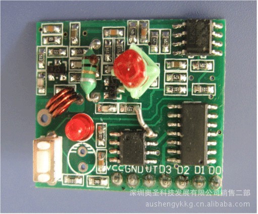 七个插针,正面从左到右是VCC、GND、VT、D3、D2、D1、D0(PCB板上有标注),其中VCC和GND接直流5伏电源的正负极。VT是有效信号输出位(接收到有效信号时,该脚输出高电平),D3到D0为四个数据位输出脚,分别对应着遥控器的四个按键。