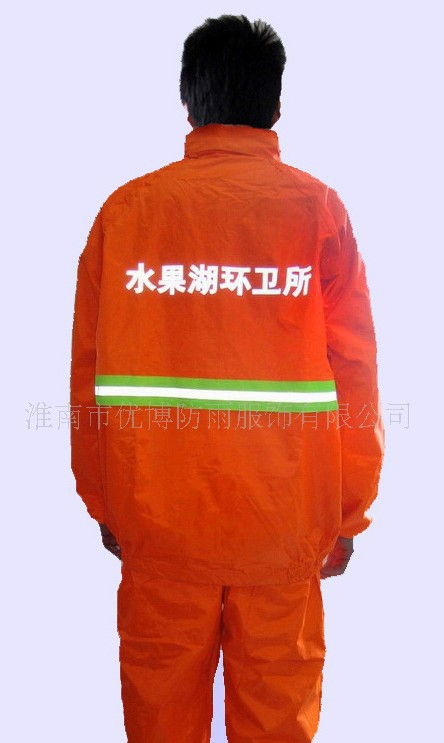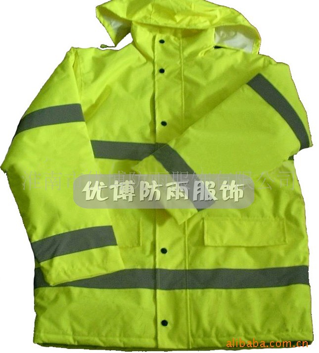 该款式为190T涤丝纺面料,加涂100%防水PVC涂层,高强度反光条,暗藏式帽子,上下身分体套装,防盗防水口袋,休闲款式!是理想的安全的野外作业防护雨衣。