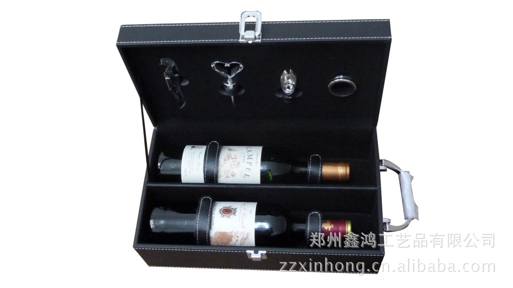 黑色PU 银手提红酒皮盒 2瓶装葡萄酒礼品包装盒(含酒具)