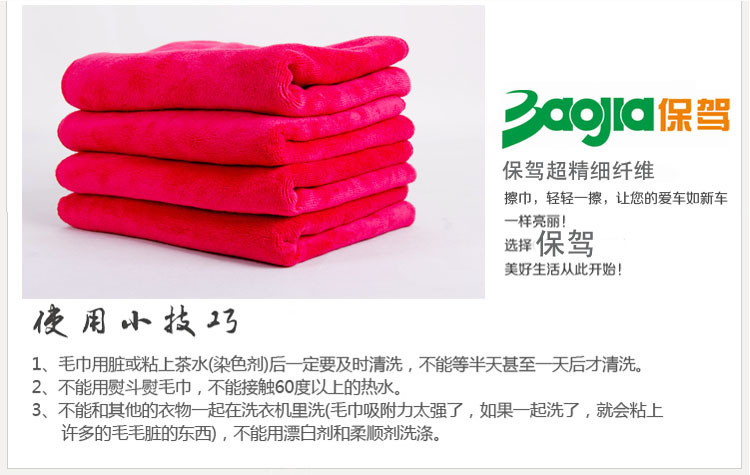 品名:擦车巾 材质:超细纤维(磨毛) 规格:40*60cm 平方克重:480克 颜色:五色 【产品描述】 本品可以完全取代普通毛巾做汽车清洁和家居清洁用品,外表看和普通毛巾无大差异,实则采用纳米纤维技术制造,仅有头发1/100细的涤纶纤维编制。特别柔软细腻,具有良好的弹性和羽绒般的手感,以及特有的静电吸尘能力。 常见的普通毛巾平方克重只有240g,就是市面上所谓的加厚版也只有300g和400g,我们也有出售,价格自然便宜。而我们保驾的有480g豪华加厚版,以及420g加厚版,亲们要看清,保驾毛巾不怕对比,价格实惠,质量才是王道!