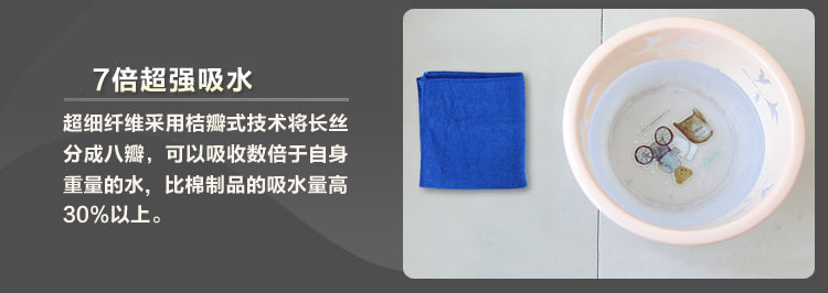 【产品特点】 高吸水性:超细纤维采用桔瓣式技术将长丝分成八瓣,使纤维表面积增大,织物中孔隙增多,借助毛细管芯汲效应增强吸水效果,快速吸水和快速变干成为它的显著特性。 1.绝不划伤被擦物; 2.绝不掉毛; 3.超吸水性:该产品的吸水量是普通毛巾的6倍;是仿鹿皮巾的2-3倍。 4.超洁净力:该产品具有超强的静电吸引能力,最细小角落的灰尘也能被清洁出来特别适合擦试汽车内饰、仪表盘、座垫等。 5.超去污力:使用该产品擦试机油类脏物后,用一般洗涤方法即可清除,表面不留油迹。 |