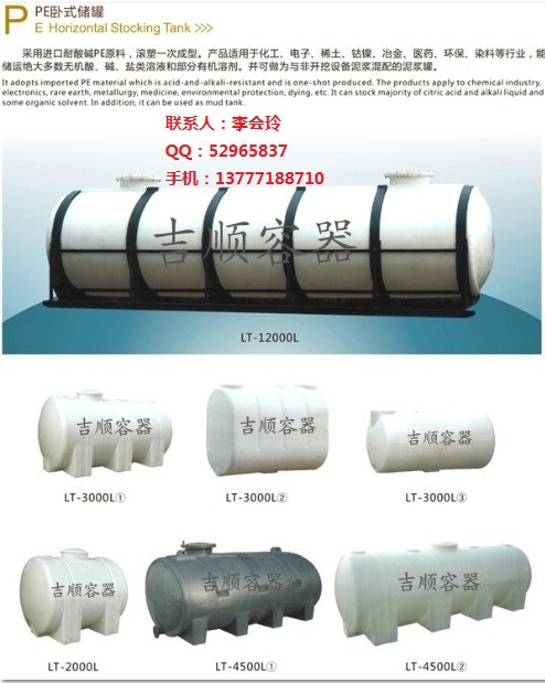 6.)厂家直销3吨卧式水箱/3立方卧式槽罐/3吨运输储罐/3吨运输水箱的使用地点:实用于高层建筑二次供水、蓄水、水处理净化设备配套、工业用冷却水、化工制剂、化工原料、各种油品、饮品、酒类的储存、运输、城市、农业、农村屋顶蓄水、宾馆、酒店理想的储配水容器,成为国际公认的理想型塑胶容器。