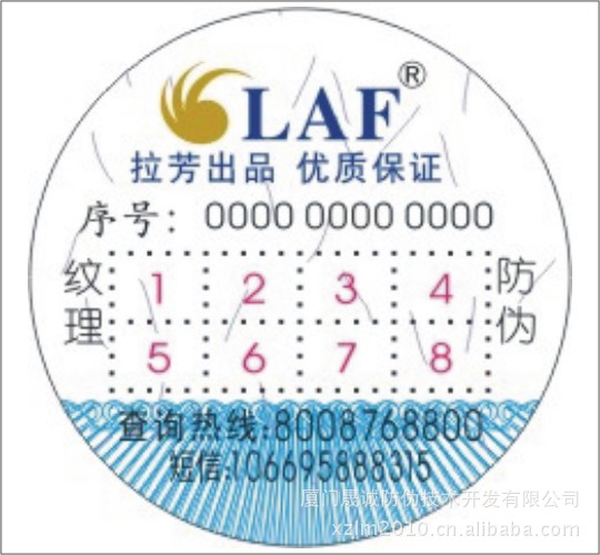 厦门晟诚防伪有限公司是集防伪技术开发、防伪产品平面设计、打样、印刷、后道加工一条龙服务,是具有综合服务能力的防伪印刷企业, 主要防伪技术有“800免费查询、400手机查询、9510特服号码查询、网站查询、短信查询及普通电话查询等多媒体防伪标贴,物流条码防伪、纹理数码防伪、高聚合防伪、局部镂空全息防伪、喷码防伪、电码防伪、窜货管理、打码喷码、卷筒防伪标、刮刮银、隐形防伪、数字水印、防伪奖券促销券、对应双层码防伪、条形码技术、激光防伪标签、封口标签、防伪编织袋、防伪包装、短信防伪、刮刮卡防伪、人民币安全线防伪技术、防伪吊牌、防伪门票、防伪水票、版纹防伪、温变防伪、荧光防伪、滴水防伪、触摸防伪、防伪油墨印刷、激光防伪、数码防伪、可变条码、三维立体、对应码防伪、促销奖券、证卡防伪及票据防伪等高难度防伪产品;并最新推出国际领先的防伪技术--解码防伪技术;二、印刷包装(不干胶、水洗标、彩色广告宣传单、画册、产品说明书、贺卡、吊牌、便笺、信封、表格、无炭纸、手提袋、彩盒、纸箱、礼盒制作,胶版、铜版、白卡、灰卡等纸张印刷及塑料彩色印刷包装)的生产;