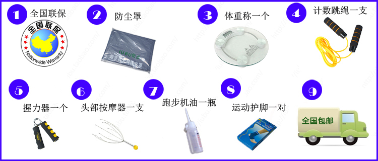 50CM超宽钻石纹跑带宽,3.5HP马力,无级变速调节器,最大时速可达18.8KM/H,采用超大触摸蓝屏(豪华配制,小工厂是生产不了的)显示器,独家专利航空级三组大弹簧减震+缓冲硅胶+八个硅胶缓冲减震系统,真正意义上的减震,而且除去了高昂的明星代言费用(羊毛出在羊身上),是目前市场上最具性价比的一款跑步机,高级磨砂黑烤漆,更显高档.这样的配置跑步机在淘宝网上都是要4000以上的价格才能买到的!