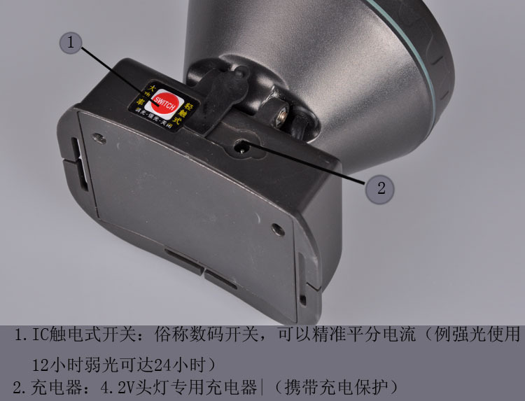 ③拨至开关一档将点亮LED亮度为弱光,该档充满电可使用约20小时;拨至开关二档LED亮度为强光灯,该档充满电可使用约12小时;拨回最后档,该档为关闭灯模式。