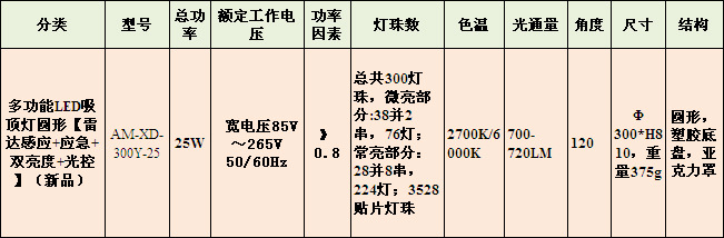 一:雷达感应双亮度LED吸顶灯 产品规格参数