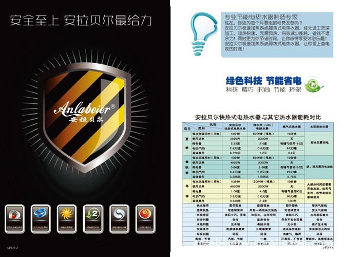 安拉贝尔即热式电热水器是目前具有结构新颖,安全可靠,技术先进,节能环保的一种新型快热式电热水器。所有产品经国家质量检测机构严格检验,完全执行GB4706.1-2005,GB4706.11-2005《家用和类似用途电器的安全快热式电热水器特殊要求》国家标准,获得了严格的CQC/CCC/CE/CB/EC/TUV等国内外权威质量体系认证,并由太平洋保险公司质量承保。