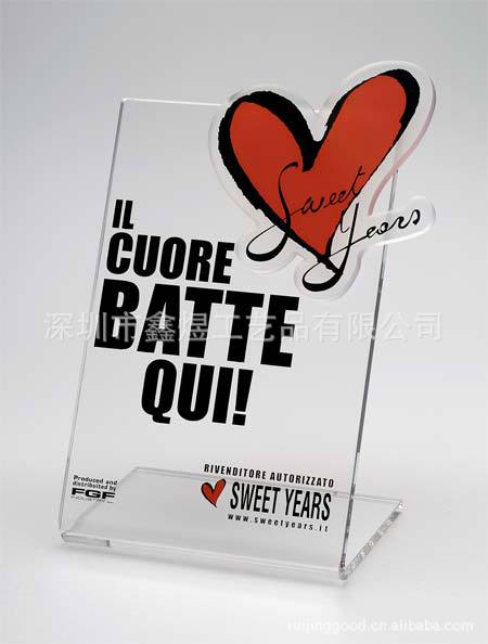 亚克力/压克力(有机玻璃)展示用品 大型卖场终端终端展示柜,压克力家居用品,有机玻璃化妆品展示架、烟酒展示架、钟表展示架,皮具衣帽展示架,电子产品展示架、文具用品展示架,珠宝首饰陈列架、眼镜展示架等各种高档产品展示用品;专业生产压克力(有机玻璃)授权代理牌、经销商牌、奖牌、POP广告牌,酒店用品、各类礼品包装盒;压克力纸镇、压克力无缝热压产品,模型及机械面板,环境导向标识系统...... 水晶胶(POLY/高透明树脂)工艺品 高档透明水晶胶内埋工艺礼品、赠品,树脂卫浴套装、树脂工艺品玩具,文具摆件,纸镇...... 旗类礼品 奖杯,奖牌,广告旗,公司旗,刀旗,手摇旗,旗座,旗杆...... 我们本着”产品是最好的代言人”、“以质量求生存、以信誉求发展”的宗旨服务客户,秉着“专业化、规模化、国际化”的发展方向,一贯秉承“诚信、服务、创新、务实、价值”的理念,得到了社会各界人士的关怀与厚爱,业务不断壮大,我们愿以自己的水准和不懈的努力,一如既往的为您提供满意产品,优质的服务。工厂直营,款式繁多,手工精细,品质优良,价格公道。