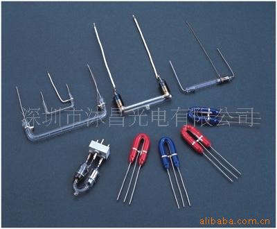 两端有金属电极。充有高纯度氙气(具有极高发光强度的惰性气体)的玻璃管,管外绕有金属细丝(第三极称引燃极),使其与闪光触发器的输出端相联,闪光触发器的输出电压(1万伏左右)接通后,管内的氙气产生电离,使两端金属极导通,引入主电容的电压,使管内的氙气产生弧光放电,发出耀眼的白光。