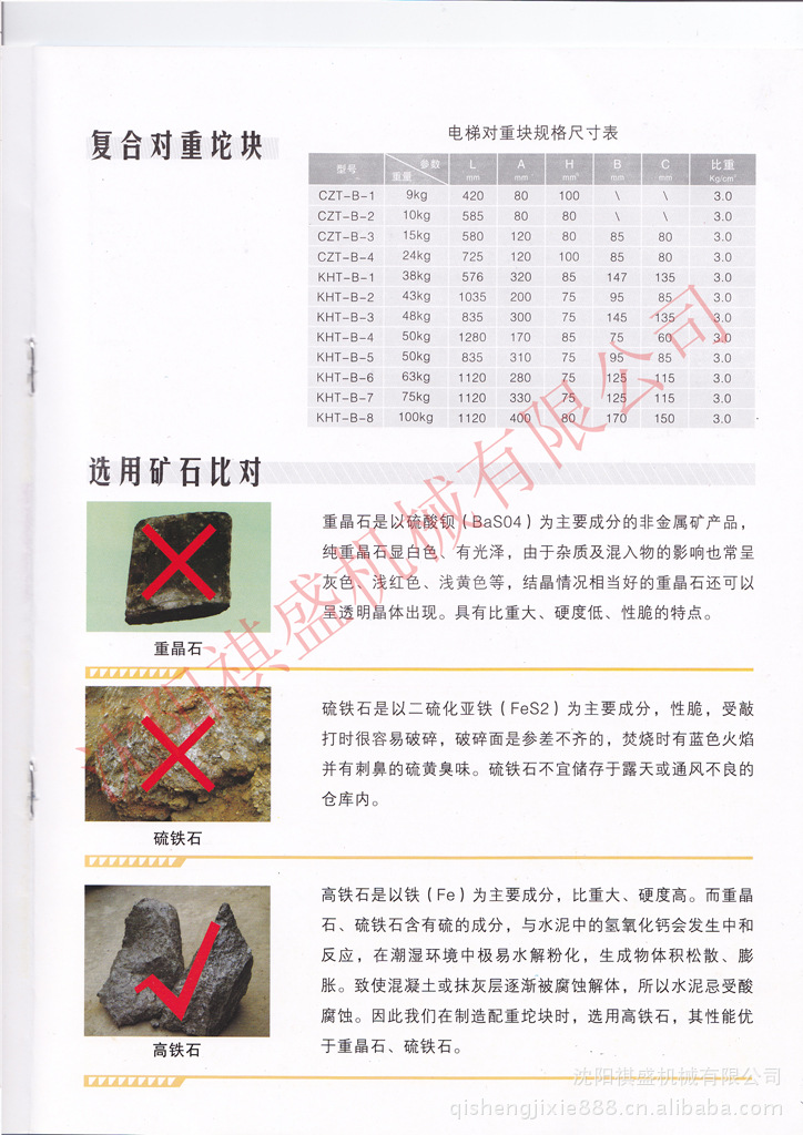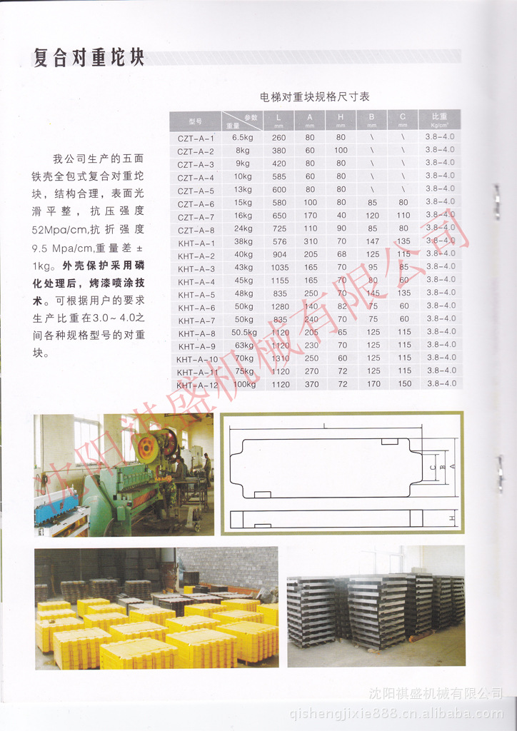 公司生产的五面铁壳全包式复合对重坨块,结构合理,表面光滑,抗压强度52Mpa/cm,抗折强度9.5Mpa/cm,重量差±1Kg。外壳保护采用磷化处理后,烤漆喷涂技术。可根据用户的要求生产比重在3.0~4.0之间各种规格型号的对重块。
