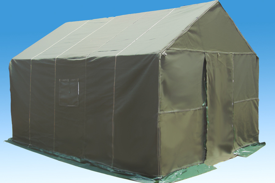 2、帐篷大顶面料为军绿色三防布(防雨、防腐蚀、防霉、防老化,拉 力强度高),山墙、围墙面料为4x3帆布(帆布具有保温、保暖功能,而且透气,冬暖夏凉),帐篷底部围一圈三防布,不必担心雨水从底部溅进。中间使用针刺毛毡,内衬白布,做工以军品帐篷为标准。窗户设有纱网,具有防蚊虫、通风等功能。