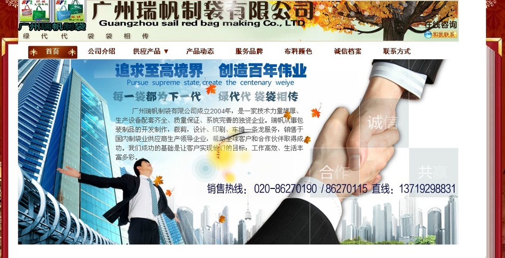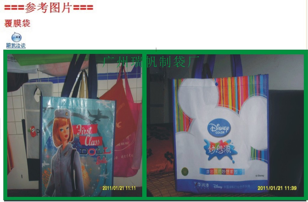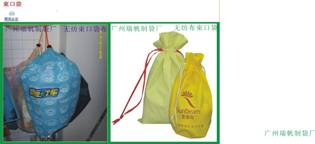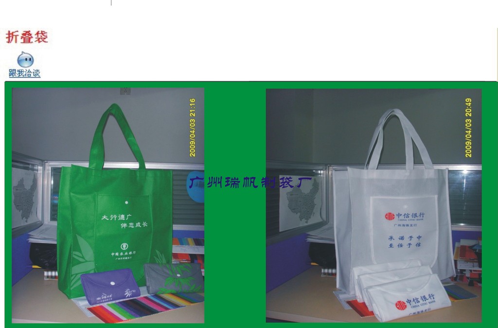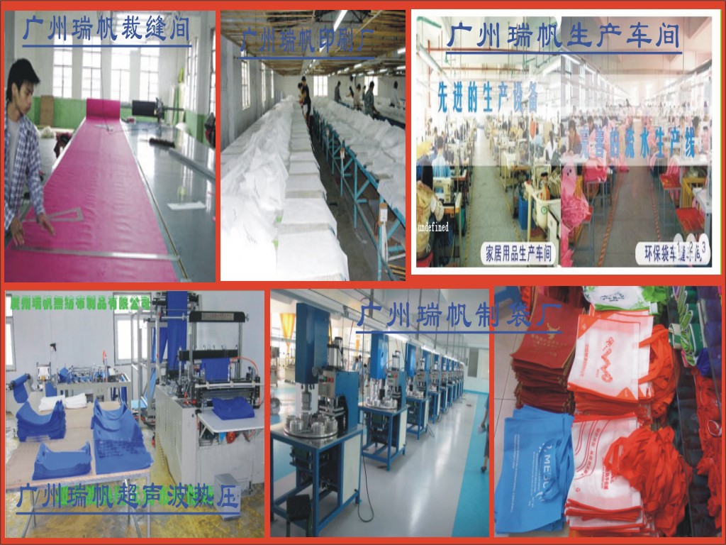 《广州瑞帆无纺布袋制品厂》是一家技术力量雄厚、生产设备配套齐全、质量保证、系统完善的独资企业。主要从事无纺布制品的开发制作,裁剪,设计、印刷、车缝一条龙服务,质量好,价格优廉。可加印LOGO,包装袋等生产服务;生产以无纺布为原料的:无纺布袋| 购物袋| 广告袋| 礼品袋| 环保袋| 包装袋| 无纺布超声波热压袋| 西装套| 收纳盒|收纳登等等开发与生产|厂房面积3000余平方米|全厂职员工200多人月产量100多万个。按客户要求的规格尺寸和印刷定做|价格合理|数量1000个起定。欢迎新老客户,来样来电洽谈。谢谢!