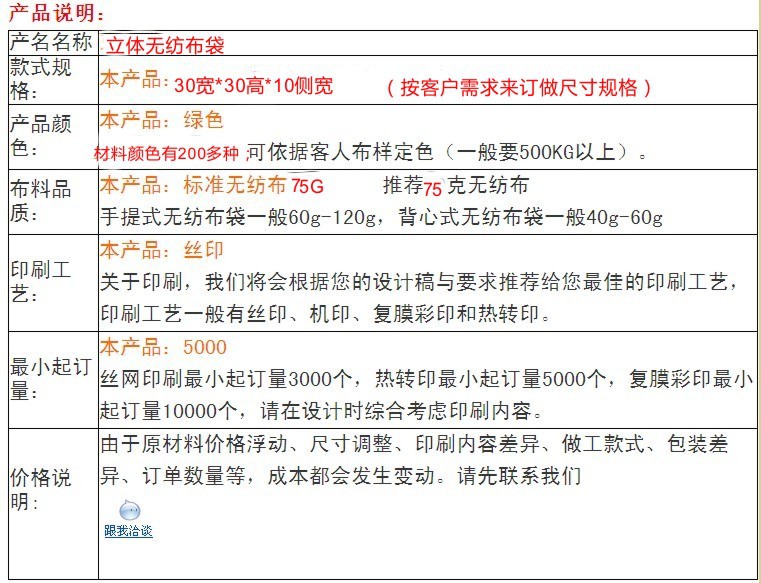 【布料材质】无纺布75g一90g | (可按照客户要求制作) |