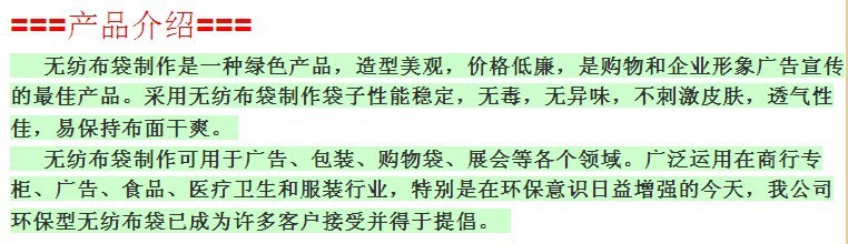 |环保袋| 环保无纺布袋| 超声波机压无纺布袋| 无纺布购物袋| 环保包装袋| 复膜无纺布袋| 无纺布红酒袋| 无纺布广告袋| 无纺布环保袋| 无纺布礼品袋| 无纺布围裙| 无纺布化妆品袋| 服装购物袋| 无纺布电脑罩| 无纺布笔袋| 无纺布资料袋| 无纺布束口袋| 商场购物袋| 无纺布礼品饰品袋| 绒布袋| 棉布袋| 牛津布袋| 尼龙布袋| 帆布袋|等等电器防尘罩|车用垫罩|衣橱柜|储物袋|医疗用一次性用品等无纺布系列环保制品|还可以按客人的要求进行加工生产。为了配合客户的不同需求,提高效率和竞争力,我们常年备有30多种颜色的现成的布今天,在各种网络信息资源不断发达的同时,每个行业也渐渐地面临更加多的机遇和挑战,放眼未来,我公司继续以“品质第一,服务至上,为客户创造最大价值”作为市场导向,让“瑞帆制袋”这个品牌继续深受广大客户的支持与信赖而努力奋斗!