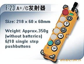 F23-A+,980/套,功能介绍:六个基本功能键,上下双速按键,其余4件为单速或八点单速。;例如:主副钩行车,起重机,MD电动葫芦或双CD葫芦等,带蘑菇头急停按键。
