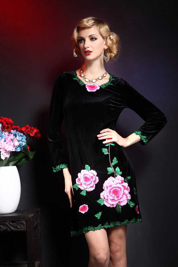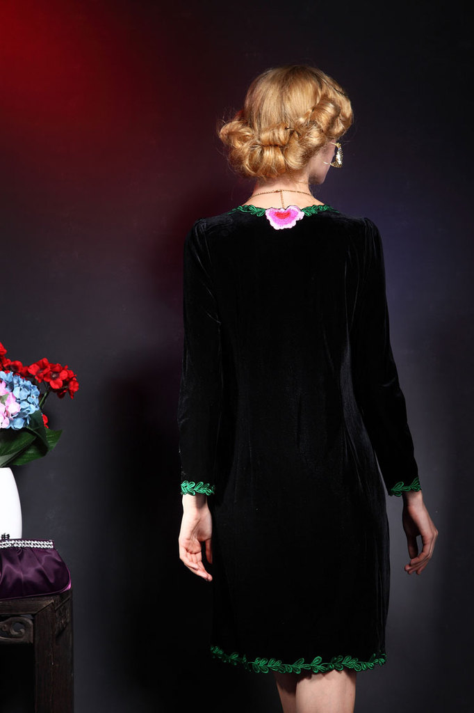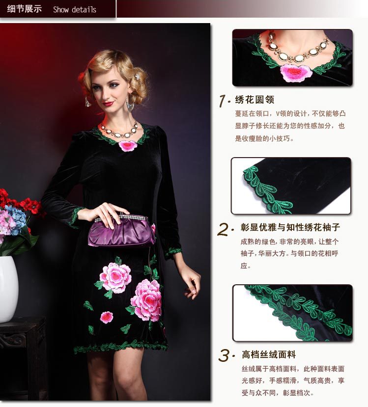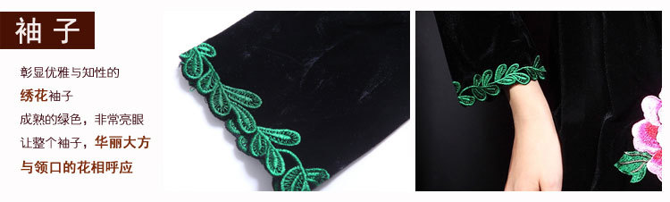 本款面料采用韩国原装进口的丝光绒面料,不但光泽效果柔和华丽,手感和穿着感都非常的柔软舒适,进口的绒面品质非常出众,面料本身四面都有弹力。丝绒手感顺滑防静电不沾尘,成衣呈现出与无论比的奢华天鹅绒质感,穿上身的裙子会自己动修饰您的身心不用担心有多余的赘肉,无论您的坐姿如何,当您站立时绝不会出现绒面出花不均匀的尴尬现象,复古民族格调的领口后肩部与袖口的超重工立体高端刺绣花相之呼应,让您再次展现知性气质之美。