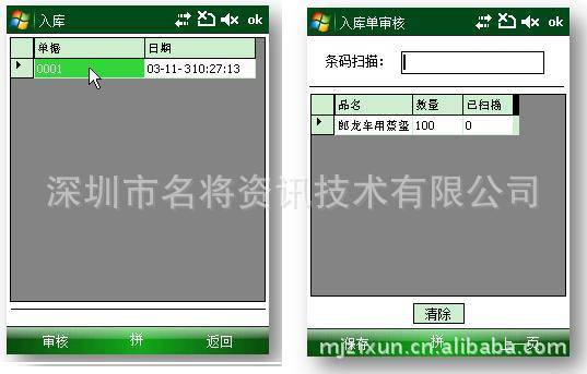 品名、数量、已扫描。第三列数量是之前入库申请单中所填写的数量。