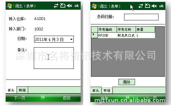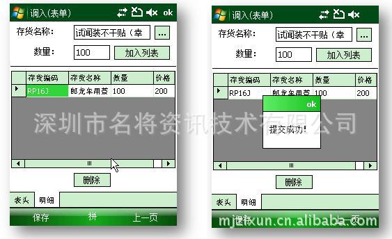 加入产品列表,输入所需调入的数量。点击保存数据将保存在PDA中