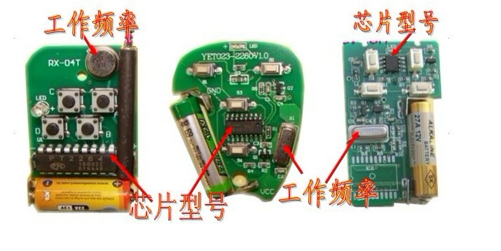 图示仅供参考,不同的遥控器寻找的方式类同 如亲无法识别,可以提供遥控器正反面线路板图发给我们 本遥控器适用于如下芯片 PT2262、PT2264、PT2260、PT2240、EV1527、FP527、FP1527SC2262、SC2260、LX2260等芯片一般后缀相同即可,如SC2262和PT2262性能兼容的, 对拷遥控不能拷贝汽车原装遥控器、滚动码遥控器。滚动码芯片一般以HCS开头,如HCS200、HCS201、HCS300、HCS301等 操作时避免干扰。勿离带电子信号的东西太近,例如手机、无线猫等无线发射类产品。确保您的遥控器电量充足,然后将您的和对拷遥控器放在一起,越近越好!先按住您自己遥控器需要被拷的按键,让其充分的发射信号后,再按对拷遥控器上待拷的按键。 宝贝实图展示