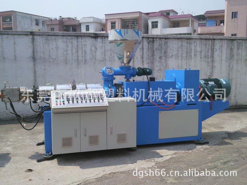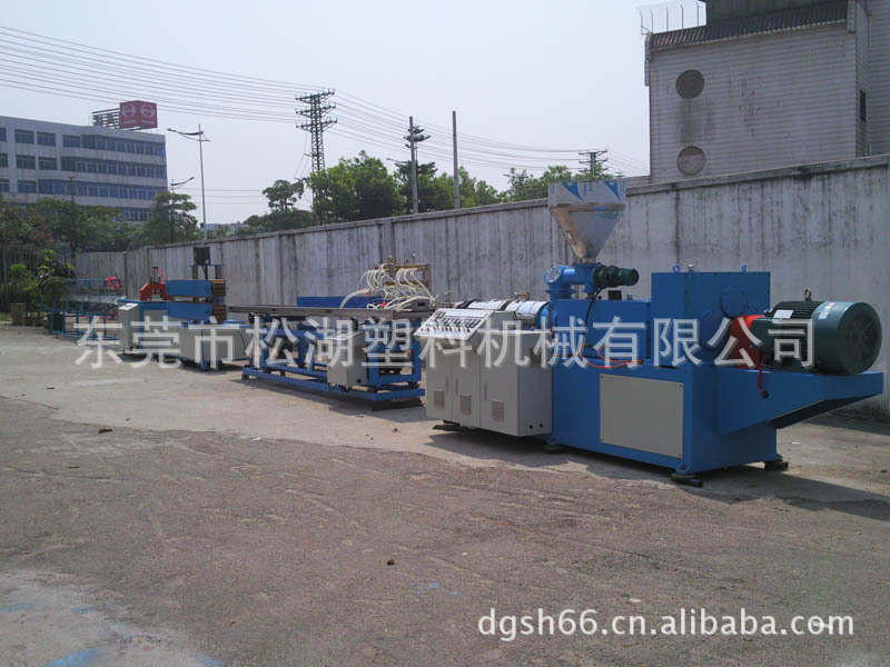 该机组由锥形双螺杆挤出机、真空定型台、牵引机、切割机、模具等组成。