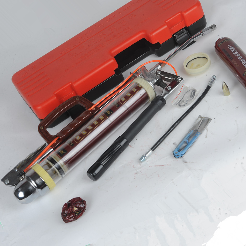 塑料保护盒、软管、硬管、尖嘴、平嘴、自吸油专用盖、备用橡胶密封圈、黄油弹剪口刀、说明书