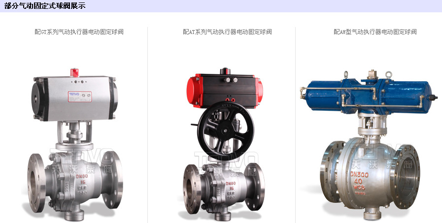 型号: Q647F、Q647H、Q647Y气动固定球阀是装配气动执行器的固定球阀的统称,TENVO气动固定球阀标配GT、AT、AW等系列执行器,根据用户选用阀门口径、压力、介质的不同,选择最合适的执行器,亦可根据客户要求,选用进口品牌气动执行器。天沃公司生产的固定球阀全部可以采用气动传动,由于种类过多,需要具体的相关性能参数和外形尺寸,请联系相关工作人员。