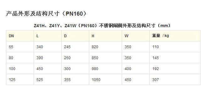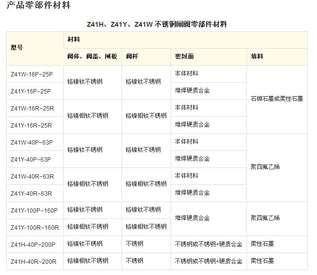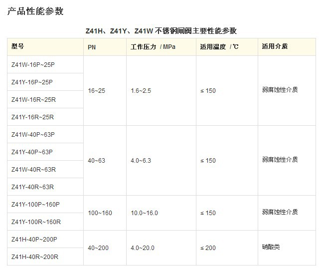 Z41W、Z41Y、Z41H 不锈钢闸阀结构紧凑、设计合理、阀门刚性好、通道流畅、流阻系数小,密封面采用不锈钢和硬质合金,使用寿命长,采用柔性石墨填料、密封可靠、操作轻便灵活。应用于工作压力 1.6MPa~20.0MPa,工作温度 -29℃~200℃的石油、化工、水力、火力电站各种系统的管路上,适用介质为硝酸类、醋酸类、水、油、气类及某些腐蚀性液体。