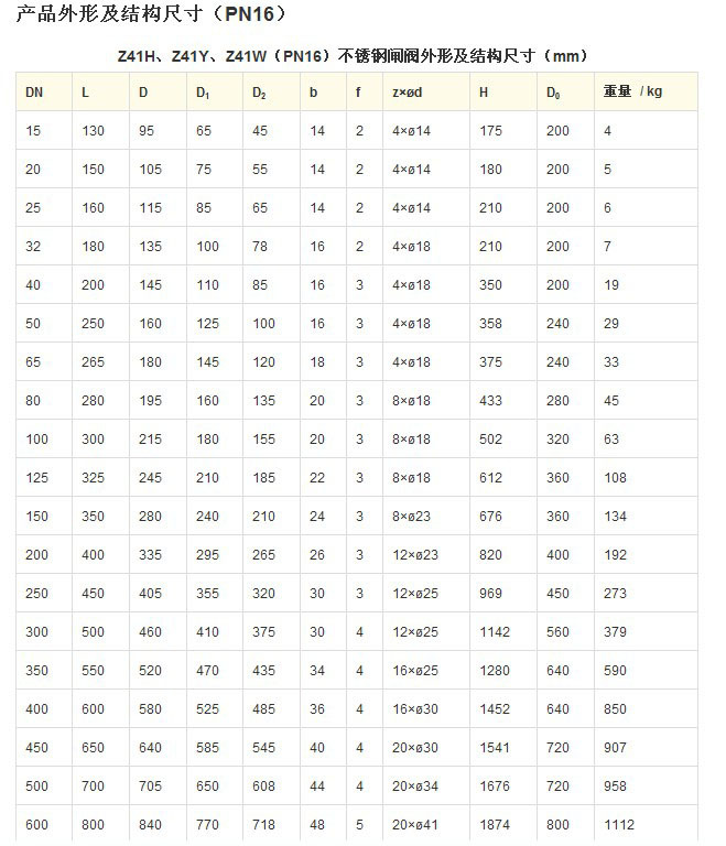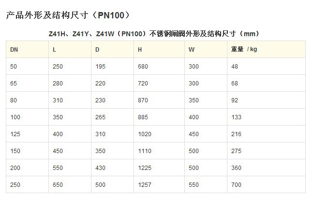 Z41H、Z41Y、Z41W 不锈钢闸阀:手动、法兰连接形式、明杆楔式刚性单闸板,阀座密封面材料为不锈钢,公称压力 PN16~PN200,阀体材料为不锈钢的闸阀。