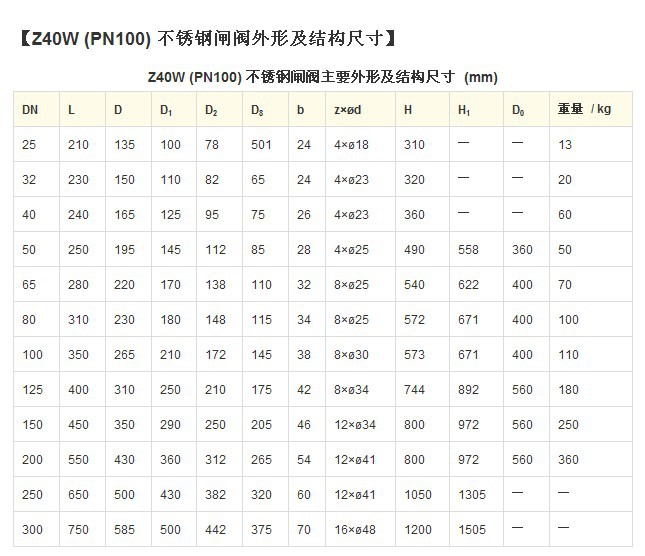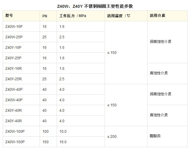 Z40W、Z40Y 不锈钢闸阀适用于工作压力 1.6~16.0MPa,工作温度 ≤ 150℃的石油、化工、水力、火力电站各种系统的管路上,切断或接通管路介质。适用介质为:水、油品、蒸汽、醋酸及弱腐蚀性、腐蚀性等介质。