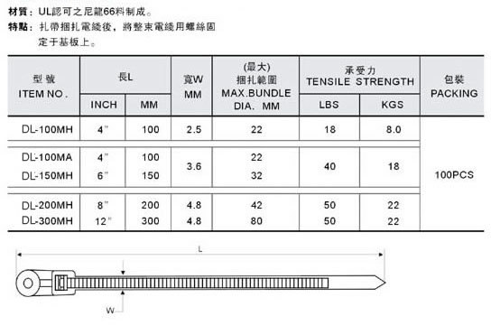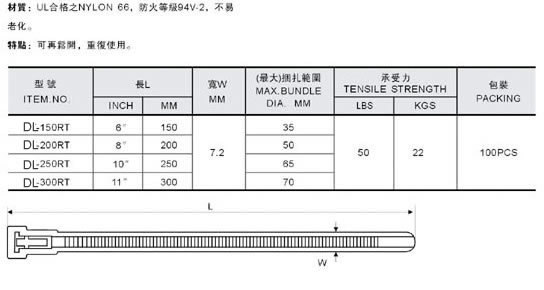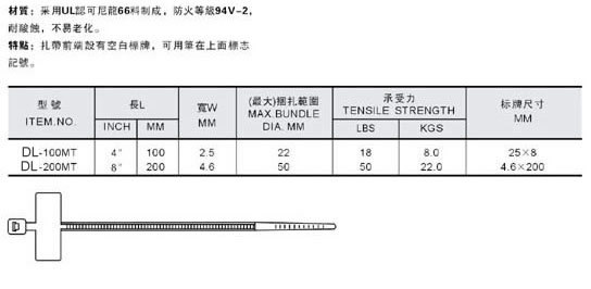尼龙扎带颜色:标准颜色为本色(白色),另有抗紫外线之黑色VU,产品有通过ISO9001认证及SGS环保材质证。