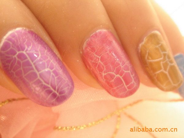 先在底色上素面指甲油一層 待乾後 在指甲上 先分別上一層裂紋指甲油~這時候比較薄 出來的紋路也會比較小