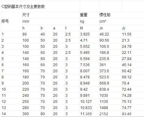 适用范围:C型钢广泛用于钢结构建筑的檩条、墙梁,也可自行组合成轻量型屋架、托架等建筑构件。此外,还可用于机械轻工制造中的柱、梁和臂等。