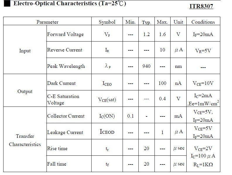 ITR8307(光遮断器 反射式光电开关 红外线对管)参数: