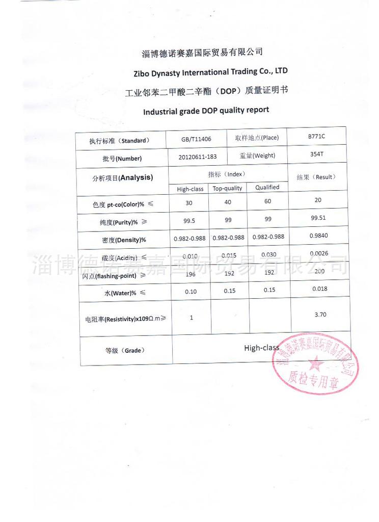 电气级DOP,具有通用级DOP的全部性能外,还具有很好的电绝缘性能,主要用于生产电线和电。