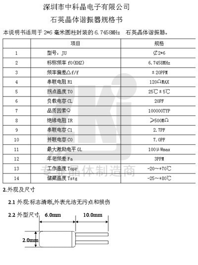 深圳中科晶专业制造圆柱2*6 6.7458MHz晶体谐振器,产品质量优异,性能稳定。可根据客户需求对型号以及标称频率进行加工定做,可提供免费的产品样品,欢迎大家前来洽谈、采购。
