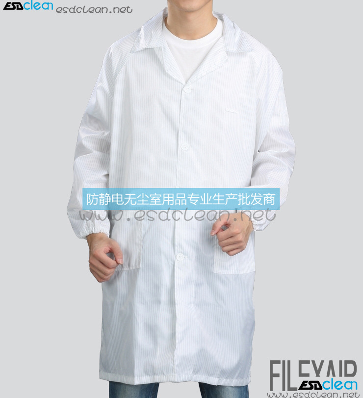 防静电大褂由防静电防尘面料(俗称导电绸),采用专用涤纶长丝与高性能永久性导电纤维经特殊工艺编造而成,具有优良持久的防静电防尘功能,能有效释放人体静电荷。