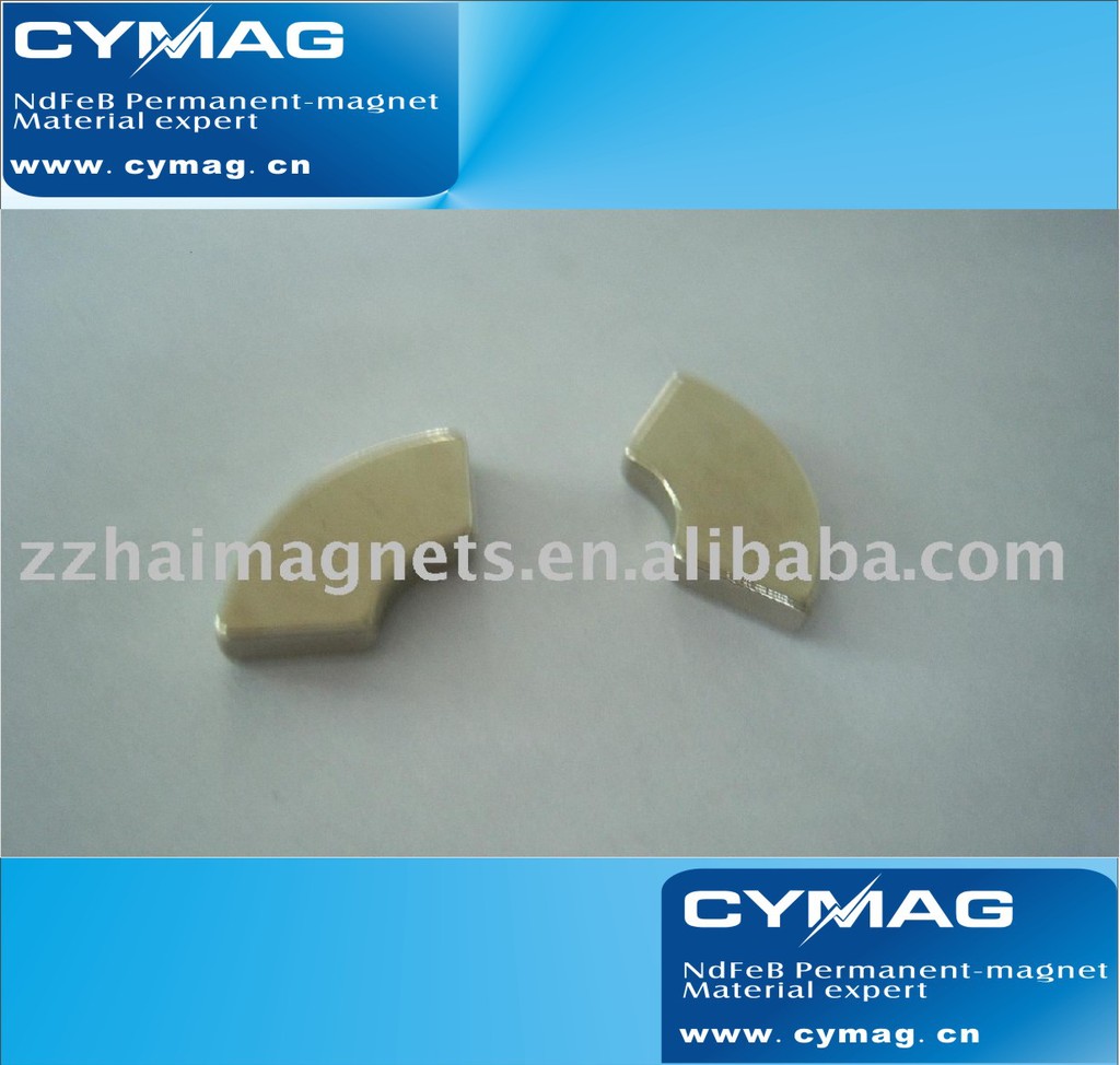 电机用磁体,在工作过程中气隙长度和体积是变化的,属动态磁路。磁体不但受到温度变化的影响,而且还受到电枢电动势对其反向退磁的影响。由于工作点是在回复线上往返变化,就使得磁体处于循环退磁状态。这要求我们在做电机磁路设计时,不但要考虑温度变化的影响,还要考虑到动态退磁的附加影响。一般功率型的直流电机,由于电枢效应,其最低工作点大约都在-0.6的地方,此时要求磁体在电机的连续工作温度下B-H曲线仍为直线,如果B-H曲线发生弯曲,磁体就会因电枢效应产生永久性退磁;另外还有对磁体在电机的极限温度下,要求其磁通不可逆损失hirr≤5% 。