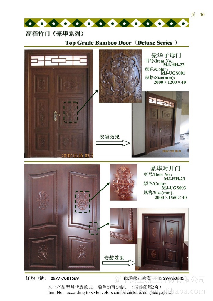 美坚“龙篁木”重竹套装门是采用美坚“龙篁木”新型重组竹材后经加工制作的高档家居门。它以云南天然优质竹子“丛生竹”(当地称为“龙竹”)为原料,从竹原料筛选,经采用公司专利“活化引胶”技术冷压热固化,到最后雕刻、油漆、成品包装,共六十几道工序精制而成。它具备了其他门材料的很多优点,首先以竹代木,继承了木材的原有特色;其次兼备了金属材料门抗冲击性、耐磨、耐压、防潮、防火等物理性能,并且安装后不开裂、不扭曲、不变形起拱。利用先进的设备和技术,同时做到了原木门的自然美感和金属材料门的防盗隔音、坚固耐用,是家庭装修、项目合作的首选材料。