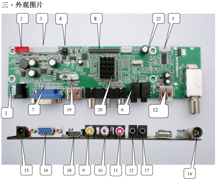 - 该产品定位中/高端的LCD TV/MONITOR方案,采用MSTAR单芯片电视处理IC,具有画质好,功能多,接口丰富,系统成熟等特点,支持全彩色/声音制式,主要针对15-26尺寸TV设计,支持目前市面上常用的LCD/LED屏。