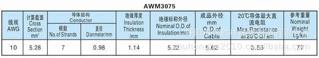 产品型号:AWM3075执行标准:UL758-2010产品特性:1、额定电压:600V2、工作温度:-60~+200℃3、导 体:实芯或绞合镀锡铜线4、绝 缘:硅橡胶5、编 织:玻璃纤维+硅树脂6、颜 色:全色谱特点/用途: 具有优良的高温耐低温性能,具有优良的电绝缘性能,优良的化学稳定性能,耐高电压,耐老化,使用寿命长。且柔软便于安装。 广泛应用于照明灯具、家用电器、电热电器、仪表仪器、电机引接线及电子、灯具、燃具等高温环境。