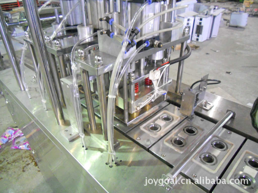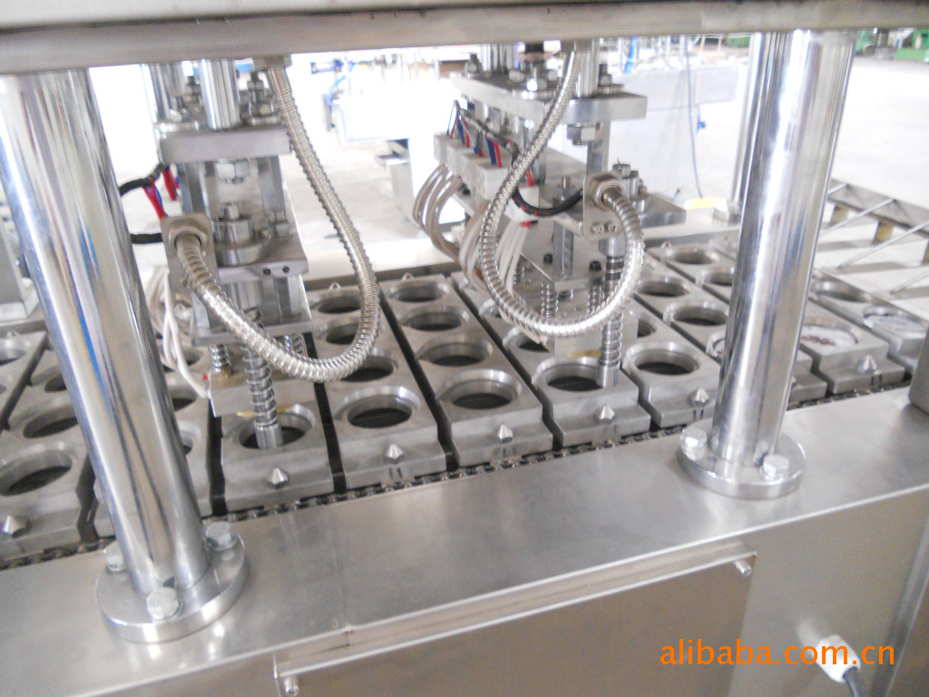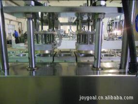 本机从送杯、充填、液位控制、放盖、两次封口、推杯、输送为全自动作业。本机为一机多用型高速全自动充填封口机。根据用户需要还可生产其它一机多用机型。本机电器及气动元件采用国际名牌产品,根据客户需要,可配用PLC控制。