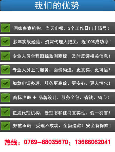 东莞华诚知识产权郑重承诺:受理书不能顺利下发,退还全部代理费用;商标注册不成功,下次注册仅收取1000元官方费用。故我们会为您提供细致的查询,精准的判断,诚心的建议,不需要隐瞒任何商标的风险。