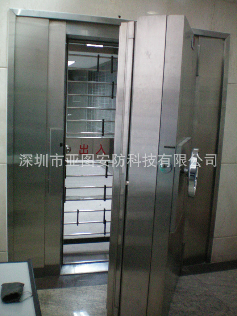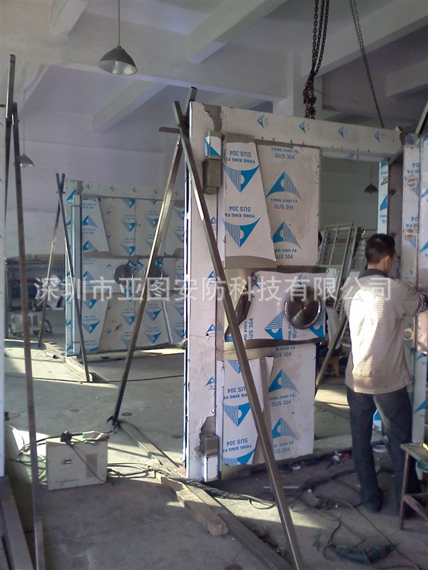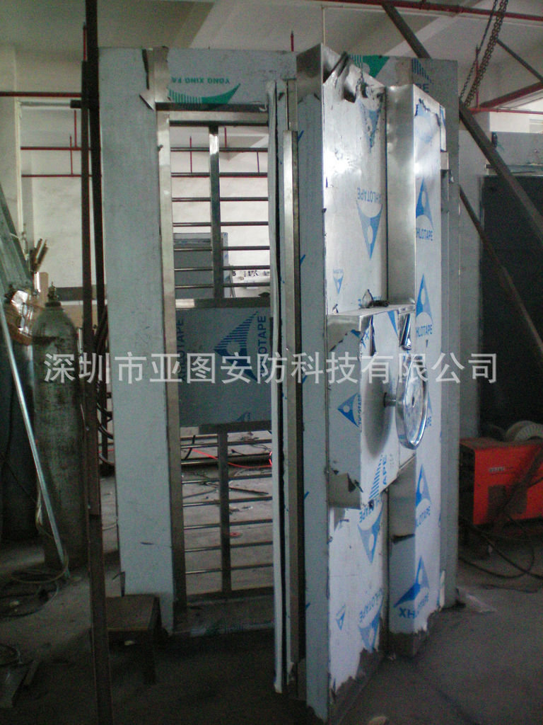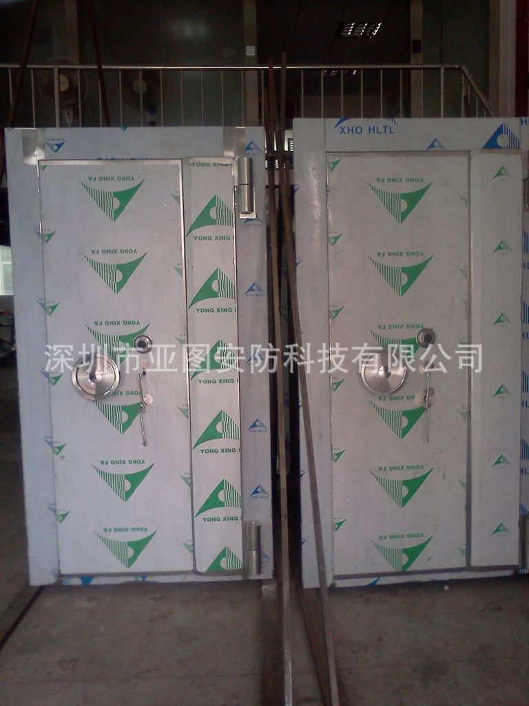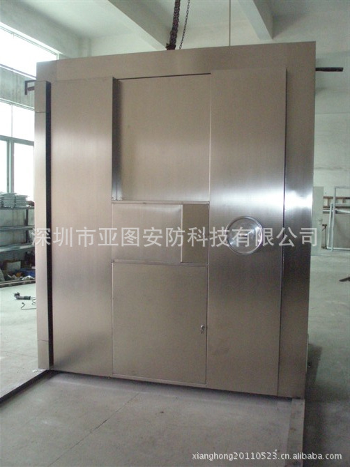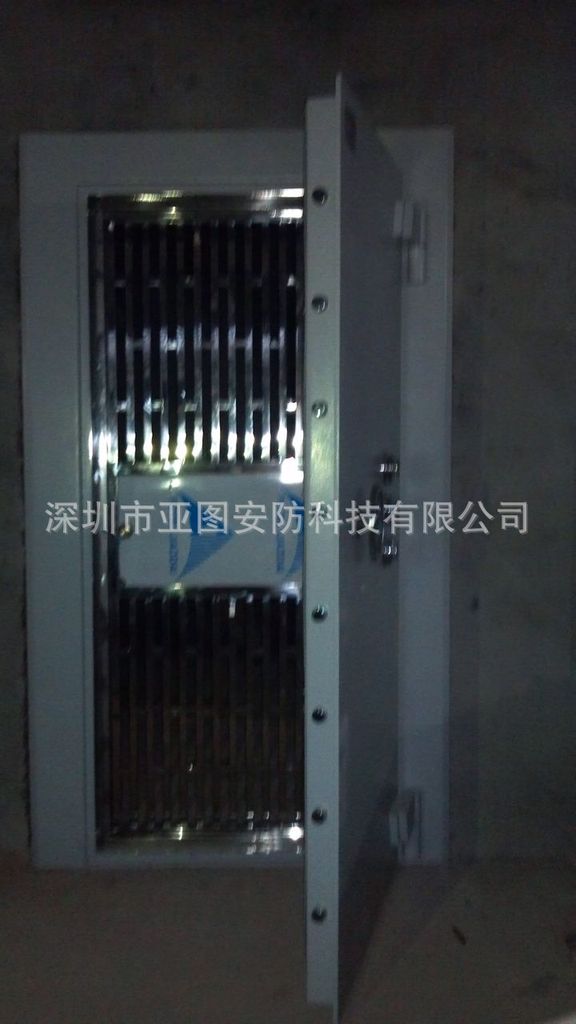 二、组成及结构特点 该金库门主要由主金库门、应急门(紧急情况下用于金库管理人员进入金库的第二通道)、栅栏门也叫日间闸门(作用是为正常开库后提供适当防护)、组合锁(均符合JR/T0002-2000《组合锁》标准要求)、门栓开合机构等组成。结构特点如下: 1、该产品门为多层板结构,外层门板为厚8毫米304碳钢板,内板为4毫米,中间框为160毫米槽钢焊接而成,中间填充防钻、防火材料和防切割板厚度为20毫米,当钻、冲击时,材料硬度可以达到H R C>8 0以上,气割时该材料会形成高铬氧化物阻止助燃。门扇整体经过机械加工抛光处理精度高、外形美观。 2、门面与门框有两个40mm的明铰链连连结(铰链轴为40mm)。 3、金库门传动机构材料为45#优质钢,经粹火镀铬处理提高了材料硬度及耐磨程度,门扇开启侧设计有4个活动门栓其直径可达30mm,锁舌伸出长度为30毫米,并以齿轮传动控制门栓滑动部分采用ZQSn6-6-3锡锌铝青铜以增加使用寿命并注入润滑油池,滑动灵活,定位准确。 4、金库门锁采用中国人民银行总行指定的机械密码锁一把和一个百叶连动专用双头锁一把组合成双锁门禁机构,更加坚固安全。也可根据用户需要增加时间指纹锁或电子智能锁。 5、门铰链设计结构,铰链侧装有4个直径为24mm的固定门栓,连接部分为内藏式,不易被任何工具破坏,轴与衬套是采用压力轴承和推力轴承相结合,相对摩擦系数小、转动灵活,使用寿命长。 6、设有安全重锁装置:当库门受到气割破坏时,重锁装置起作用,将门闩锁死,即使库门锁定机构被破坏,库门也不被开启。 7、本金库门的应急门材料与主体门一样优秀,同时装有密码和百叶式双锁头连动锁,形成双锁结构,加强了防盗性能,也为紧急情况下管理人员出入金库提供了方便。 8、日闸门在设计上采用优质20×20×20钢管焊接而成,且装有隐蔽式防盗门锁,在金库门开启后,日闸门起到第二道防护作用。也可以安装TM卡电子防盗锁,使管理人员进出更加方便联系电话13825292922 0755-26433389 向小姐