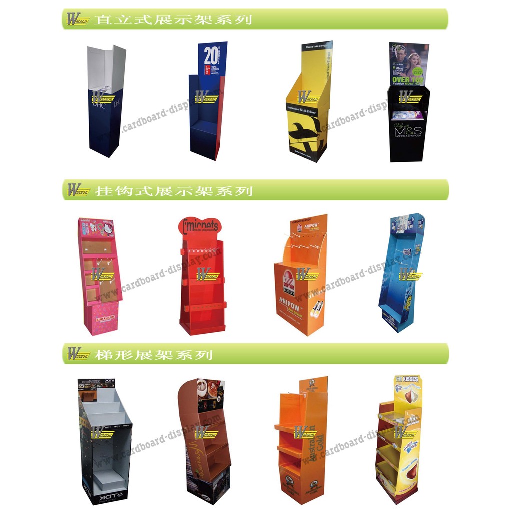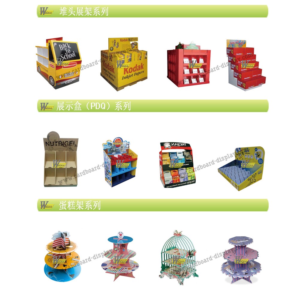 杂志纸展示架,洗发水促销纸展架,挂钩眼镜纸陈列架,可旋转挂钩纸展示架,超市促销纸堆头,格子纸展示架,CD/DVD纸陈列货架,食品纸展示架,咖啡纸陈列货架,婴儿用品纸展示架,化妆品促销纸展架,防晒产品纸货架,面膜促销纸货架,调味料纸促销架,回收电池纸展示箱,LED灯纸广告架,节日礼品纸促销架,节日货品纸促销展架,手机吊饰纸陈列货架;纸广告牌,纸促销架,纸立牌,纸展示柜,纸陈列箱,纸投票箱,纸促销柜,纸堆头;文具纸展示盒,香水纸陈列座,眼影纸展盒,唇膏纸促销展示盒,饮料纸促销盒,柜台纸陈列盒;纸蛋糕架,蛋糕纸陈列架,蛋糕纸展架,生日party蛋糕纸展架;等等……