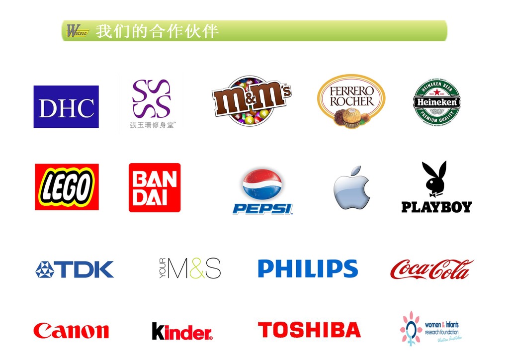 合作伙伴:与健达巧克力、迪士尼、DHC、Tempo、屈臣氏、TCL、Findus、中兴、长虹等众多国内外知名品牌有着良好的合作伙伴关系