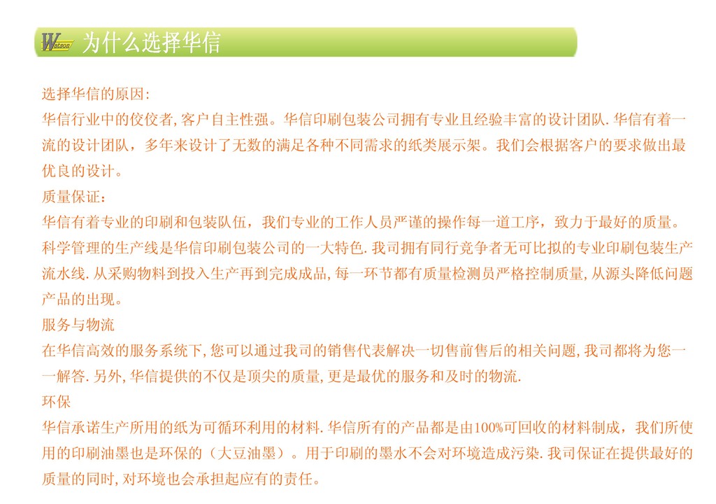 华信从2001年成立起,在印刷包装行业积累了十几年的丰富经验,成为今天集开发、设计、生产、服务为一体化的印刷包装龙头企业。专业生产纸展示架、纸展架、纸货架、纸陈列展架、纸展示柜、纸陈列箱、挂钩纸展示架、挂钩纸陈列架、纸促销架、纸广告牌、宣传纸立牌、纸堆头、纸促销柜、纸蛋糕架、蛋糕纸陈列架、纸展示盒、纸陈列盒,杂志展示架、眼镜挂钩纸陈列架、多面挂钩可旋转纸展架、面膜促销纸陈列展架、朱古力纸展示架、化妆品促销纸货架、手机配饰纸陈列货架、饮料促销纸陈列展架、日用品促销纸展示货架、书籍纸货架、药品纸货架,及各类手工盒、礼品盒、包装彩盒、包装纸袋等各类印刷包装纸制品。