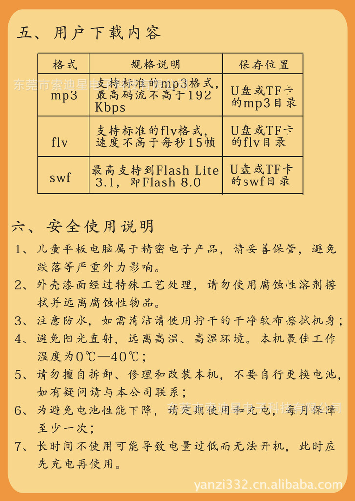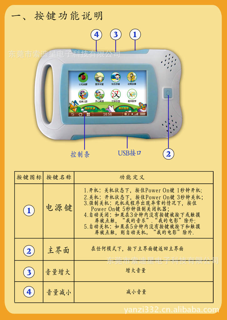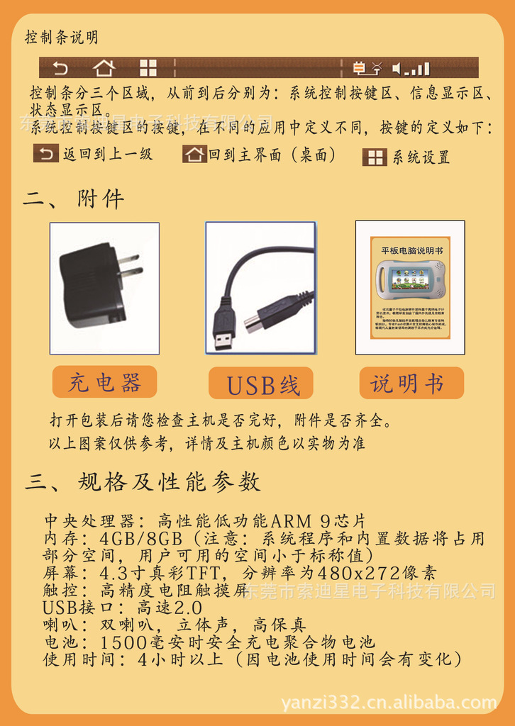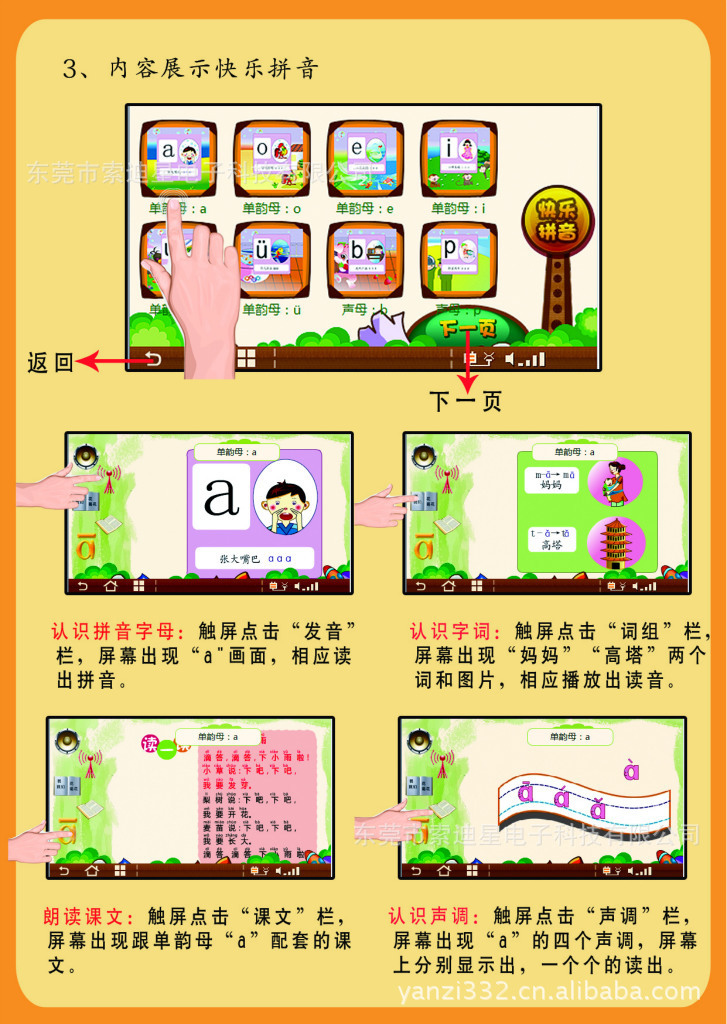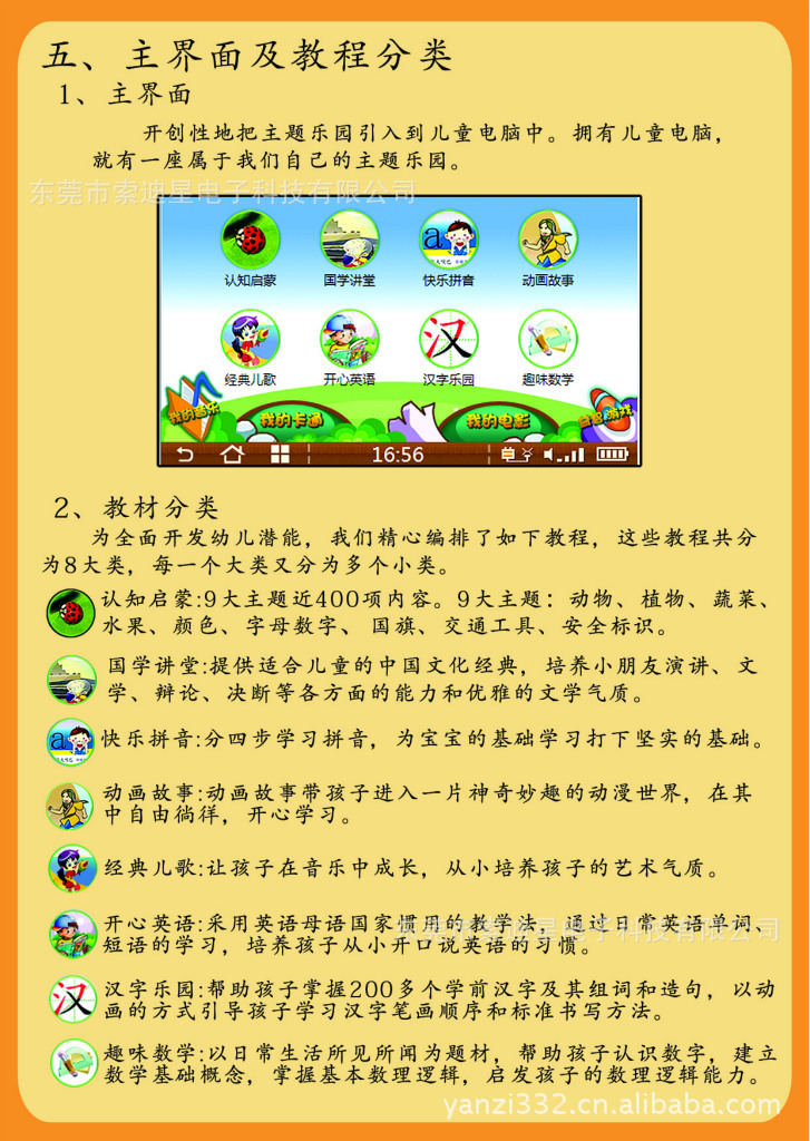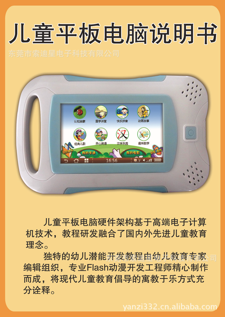 本公司主要生产儿童平板电脑、早教点读笔、古兰经点读笔、插卡小音箱、故事机、儿童MP3及周边产品,服务于OEM客户,代理商、批发商,提供研发设计、制造、售后服务等一系列服务,产品畅销全球,年销售额上亿元。我们依靠科技创新,不断为客户提供满意的高科技产品是我们始终不变的追求。