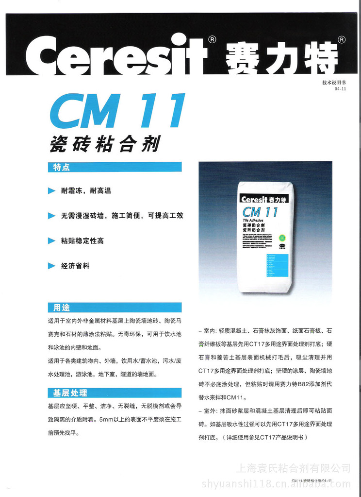 | 温度5℃至30℃,避免强日照和雨淋,配备水电和脚手架。气温过高,风速过大时进行室外施工,请征询技术意见。CM11含有水泥,遇水会产生碱性反应,使用时请注意保护皮肤和眼睛。如发生接触,请用清水仔细冲洗。如遇眼部接触,请及时就医。 |