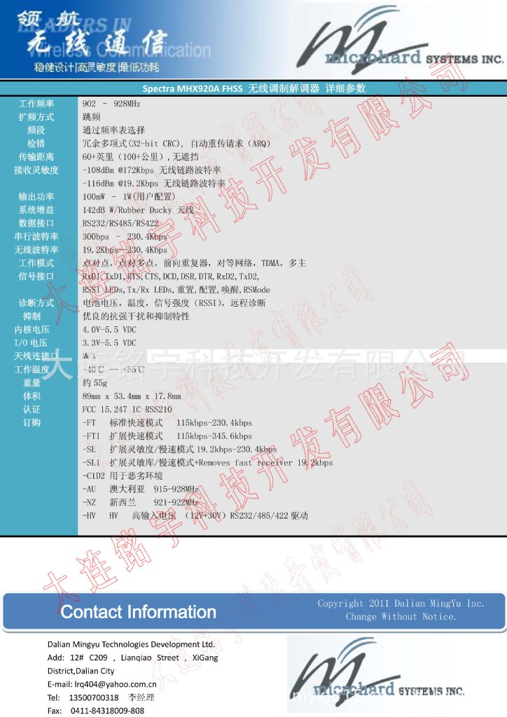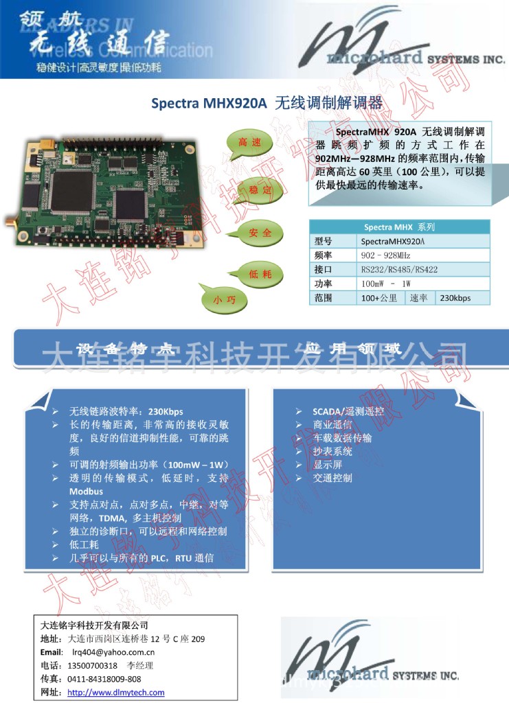 SpectraMHX 920A无线调制解调器跳频扩频的方式工作在902MHz—928MHz的频率范围内,传输距离高达60英里(100公里),可以提供最快最远的传输速率。